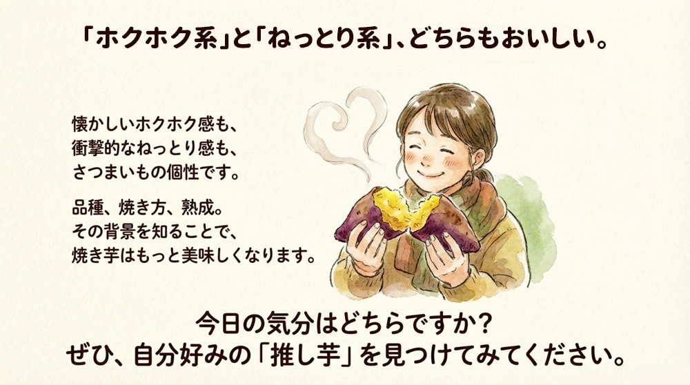 同じさつまいもから作る焼き芋でも、ホクホク系とねっとり系でこれほど違いが出るのには科学的な理由があります。